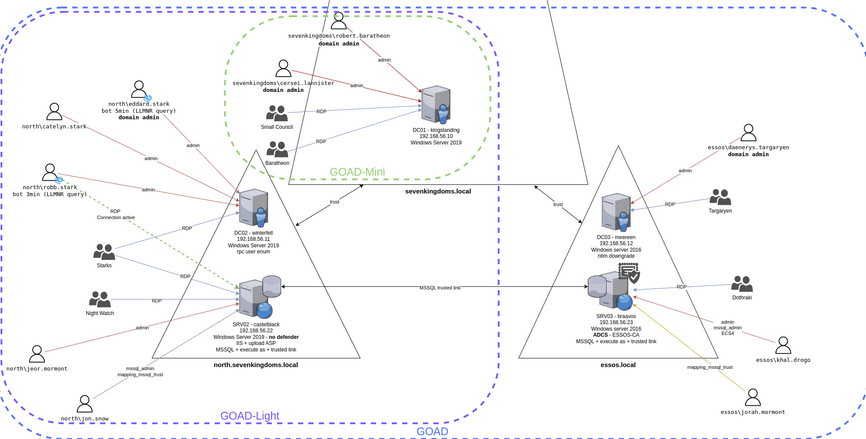 For the intentionally vulnerable lab I chose to use the Windows penetration testing playground developed by Orange CyberDefense called Game of Active Directory as detailed in a previous post. The GOAD lab is available in a variety of sizes, I chose the full lab as it creates a structure of 2 forests, 3 domains across 5 virtual machines. This is a setup that I would have difficulty configuring in my own environment, and will be the focus of much of the security research done in this project.