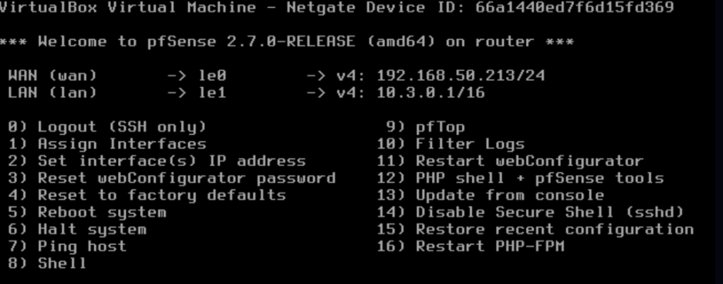 As shown below my PFSense is getting a WAN (“internet”) connection from my physical router via DHCP and I set the LAN to 10.3.0.1/24. PFSense can even set up a DHCP server for the LAN, however I used Static configurations so I must remember to set the Default Gateway and DNS to the router LAN IP address to use it to access the internet.
