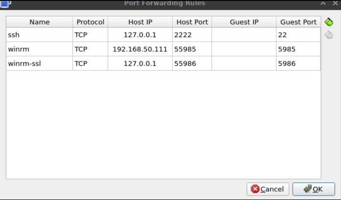 Making IP address changes can be done on the five machines manually, by logging into each as username:vagrant and password:vagrant. This provides a local Administrator user with which the Network Settings can be changed on the machine. However, for fun I decided to set up the lab to be able to administer remotely. This requires that we investigate how vagrant was connecting to the machines. It turns out that each NAT interface is sharing the same IP Address with different ports mapped via NAT to allow access via SSH and WinRm to the hosts. WinRm seems like the logical choice to get a powershell session to change IP Addresses remotely. We can view the port-forwarding rules for each NAT interface in Virtualbox by clicking the adapter and selecting “Advanced” as shown below: