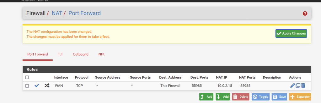 I changed the host-IP for winrm in each of these entries to reflect the IP Address of the HOST machine (Debian 12), so that I could access the machines from my Windows laptop to utilized powershell commands. Then we must create port forwarding rules in PFSense so that when we connect using the PFSense router WAN IP address, we are actually connecting to the individual GOAD boxes. An example of this type of rule is shown below: