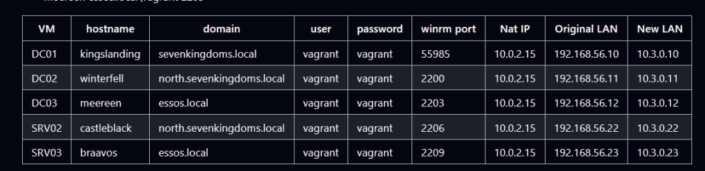 With networking in place, I worked to get the internal GOAD network set up as shown in the following table: