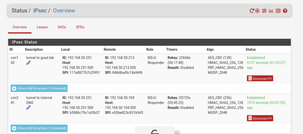 Each phase 2 connection sets the local subnet to connect to. For example in the tunnel connecting GOAD to the Distributed Lab, it will be connecting 10.5.0.0/24. Again, encryption algorithms are negotiated as well as rekey times.