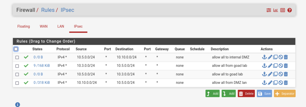 I will be connecting tunnels to be able to gather logs from all hosts into a SIEM as well as practice penetration testing ADCS from one kali box on the 10.5.0.0/24 subnet. To accomplish this the router in the GOAD network will tunnel to the Distributed Lab. The first router in the DMZ lab will tunnel to the Distributed lab. This means the Distributed lab will have two IPSec relationships as shown below.