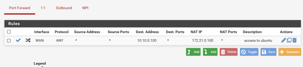 Note: Because the first router in the DMZ connects to another router for the internal DMZ LAN, NAT rules will need to be created to allow access to the hosts on the LAN subnet. To help with this, PFSense has a handy feature called “Virtual IPs” which can be used for aliasing internal IPs to create a 1 to 1 NAT setup. Because this 1 to 1 NAT is only setup on the internal router, the internal VMs are still shielded from the WAN by the first router. I will be mapping the aliases in the form of 10.10.0.xx, with the last octet matching the last octet of the host in the 172.21.0.0/24 LAN subnet.