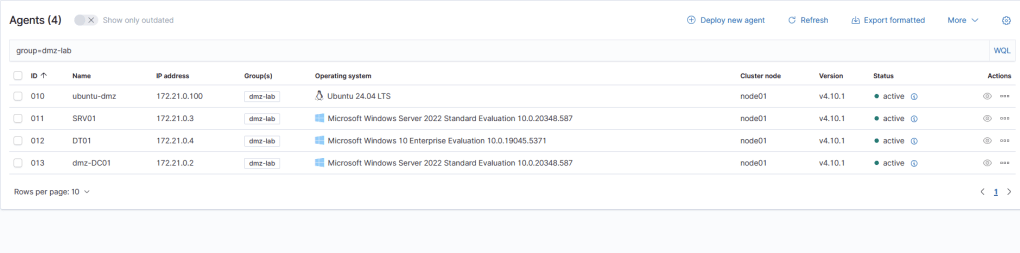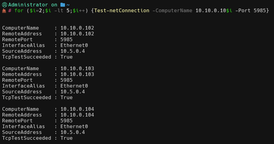 To reduce the time to set up agents, especially in the DMZ-internal LAN subnet which cannot be reached without the tunnel, I deployed the agents remotely from the DT01 workstation in the certlab.local (“Distributed Lab”). First, to check that winrm is running on all the machines i used the command:
