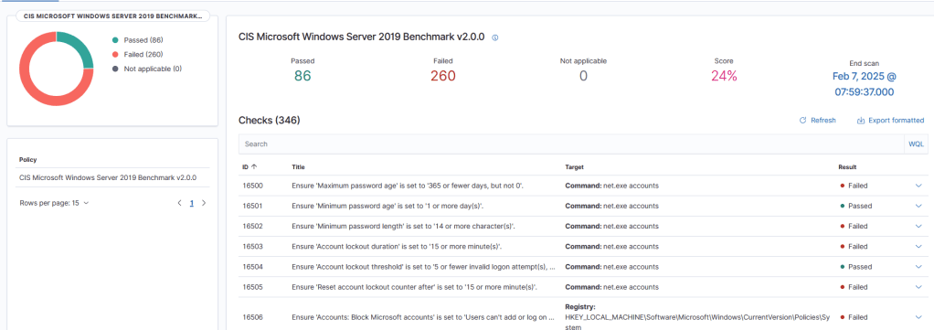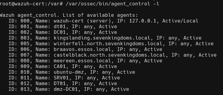 Installing and starting the wazuh agents is a simple process especially given that there is one windows msi executable which creates the ‘wazuhsvc’ service for all Windows versions (back to XP!). Using the WAZUH_AGENT_GROUP variable when deploying the agent allows us the ability to organize our agents lists and apply blanket configurations to all group members. We will revist creating detections when we begin to test ADCS deployment and vulnerability testing in subsequent labs. Out of the box, Wazuh provides decoders for Windows evtx log files and even runs a CIS Benchmark checklist as shown below!
