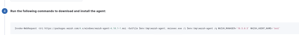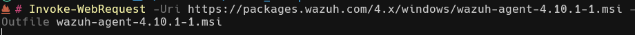 Invoke-WebRequest -Uri https://packages.wazuh.com/4.x/windows/wazuh-agent-4.10.1-1.msi -OutFile $env:tmp\wazuh-agent; msiexec.exe /i $env:tmp\wazuh-agent /q WAZUH_MANAGER='10.5.0.5' WAZUH_AGENT_NAME='test'