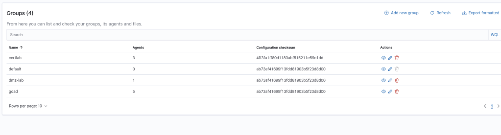 Another feature that can be useful when setting up the agents are the “Agent Groups”. Wazuh settings are configured using files on either the agent, the server, or both. Also, by setting the agent hosts in groups a shared configuration can be added to apply to all the agents in the group.
