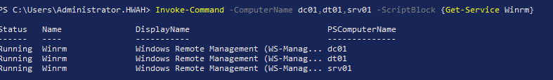 Invoke-Command -ComputerName dc01,dt01,srv01 -ScriptBlock {Get-Service WinRm}