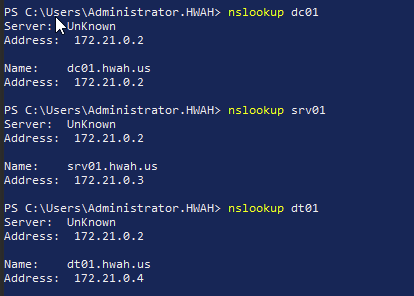 This command was run from the DT01 machine on the hwah domain (“DMZ lab”). I also gathered the internal IPs with nslookup: