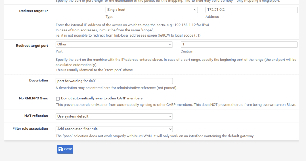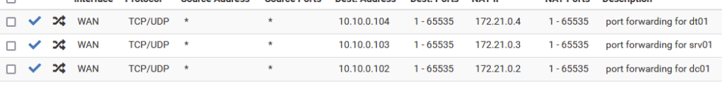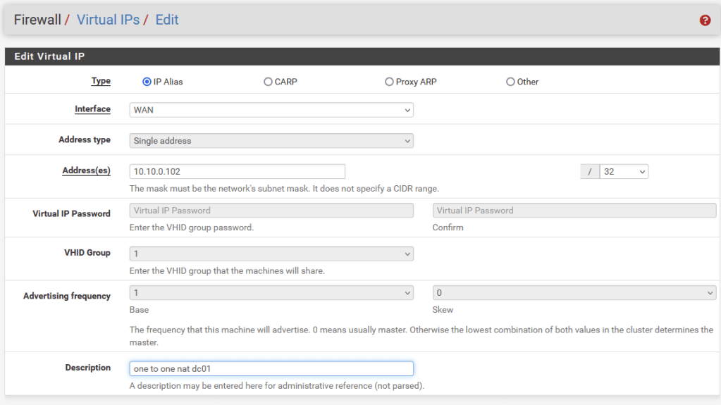 Next, I created Virtual IPs for each box in order to set up one-to-one NAT rules, mapping unique on the WAN of the internal DMZ router to IPs in the LAN. A great feature of PfSense’s Virtual IPs is you can set an “IP Alias” which assigns an arbitrary WAN IP to use for NAT. The screenshot below shows that I used 10.10.100.102 as a Virtual IP intended to map to 172.21.0.2 (DC01.hwah)