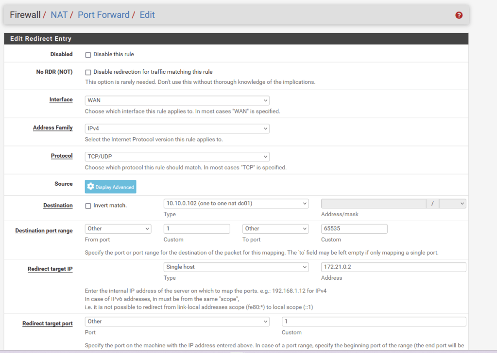 Next, each Virtual Ip will get Nat rules mapping any port on the Virtual IP to the corresponding port on the LAN connected device. We can later restrict this by removing ports or enforcing firewall rules.