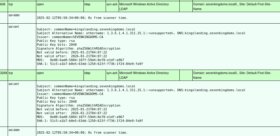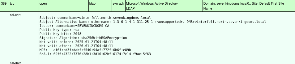 LDAP and LDAPS ports have certificate with an OID 1.3.6.1.1.1.311.25.1, which according to the Microsoft documentation is used as a Subject Alternative Name to specify the GUID of the Directory itself. The dns name is kingslanding.sevenkingdoms.local and indeed the certificates CommonName is SEVENKINGDOMS-CA. Even more information on the root certificate can be revealed by using openssl s_client to directly bind to the LDAP ports and view the certificate: