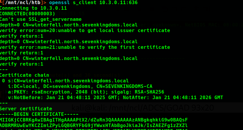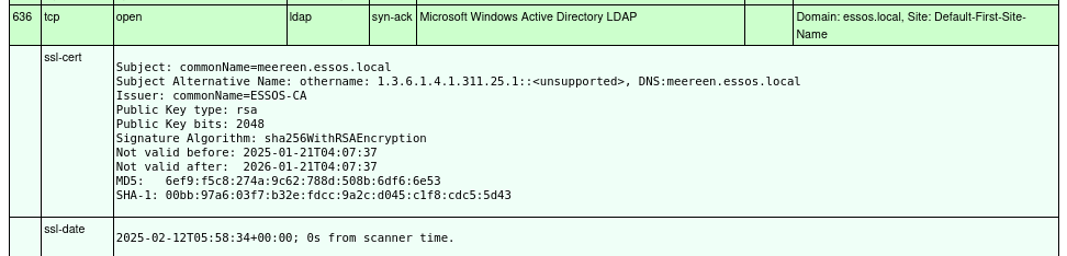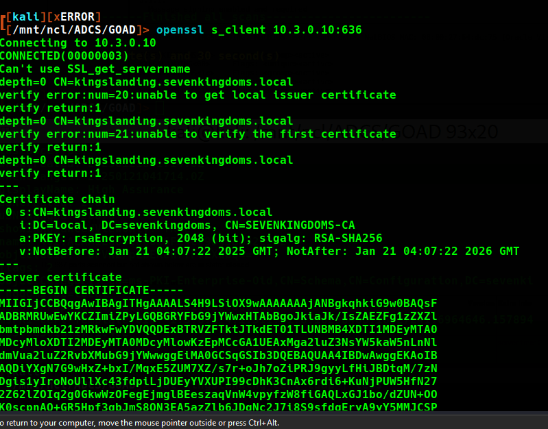 From the initial scan there are a few indications of certificate authorities being present. Nmap successfully retrieves information about certificates being used for https, ldaps, rdp and more. For further information I also connected the ports with openssl. The most interesting information pertains to the name of the Certificate Authorities, which we can later use when attempting to exploit vulnerable certificates and CA configuration.