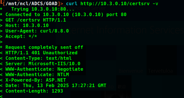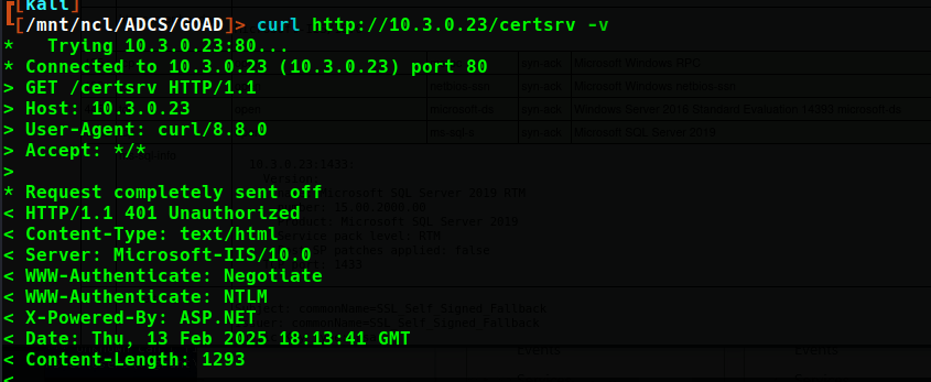 As this site does not use HTTPS, it may be susceptible to NTLM authentication and, therefore, NTLM relay attacks. This technique is detailed in SpecterOps’ Certified Pre-Owned paper as ESC8. NTLM authentication to the certsrv page can be verified by viewing the response headers via curl.