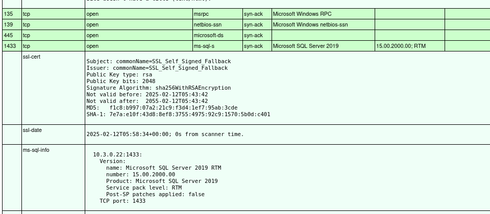 This server contains the MSSQL service. However, it seems to use self-signed certificates for this service and Remote Desktop. It is a member of the north.sevenkingdoms.local domain, and if it is vulnerable to a coercion attack could possibly be used for NTLM relay to the sevenkingdoms-CA. Also, as this is not a domain controller, we may be able to use this server for SMB relay attacks to achieve NTLM authentication, as signing is enabled but not required. SMB signing wards off relay attacks because authentication is cryptographically bound to the machine that requests it, checking for integrity like a digital signature. Signing is enabled and required by default on Domain Controllers but is not on Domain Computers.