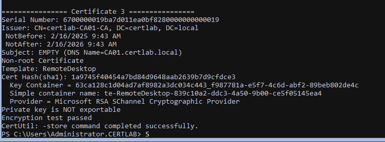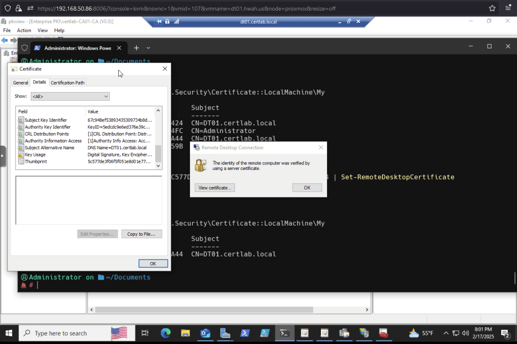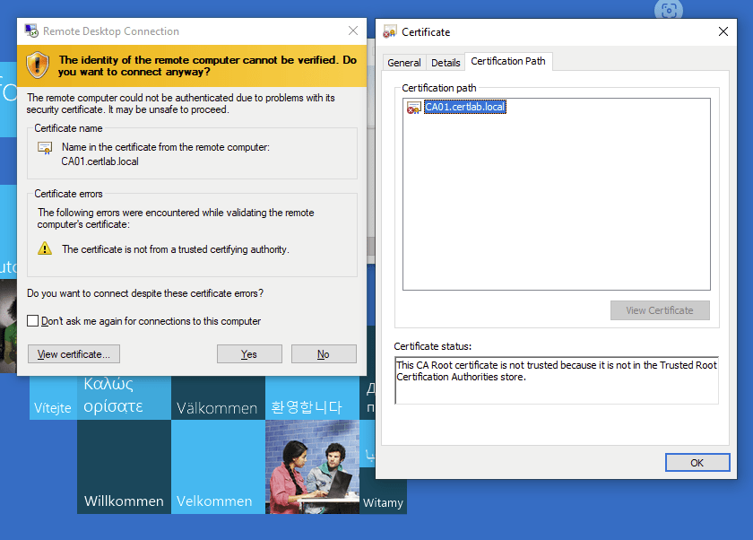 As shown below the chain is present, however remote desktop gives errors regarding the hostname in the cert. As we don’t have DNS resolution between the two domains RDP doesn’t quite trust the chain yet.