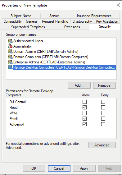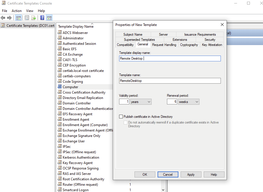 Before addressing issues regarding DNS resolution from the remote domain, I will create a specific template to provide RDP certificates in the “Remote Desktop Computers” OU on the certlab.local domain. The template will be created as a copy of the default “computer” template available in our CA.