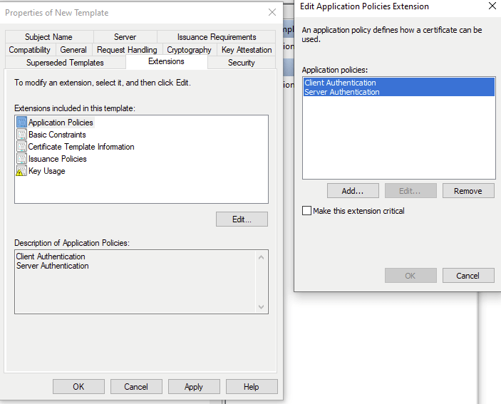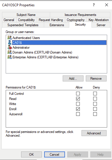 Then, the certificate can be distriubted automatically via our GPO by selecting autoenroll and enroll for manual requests as the machine account.