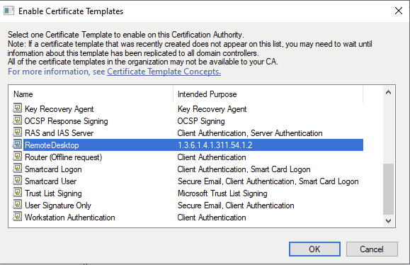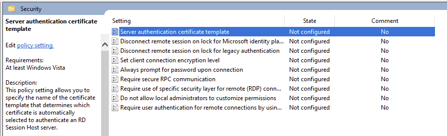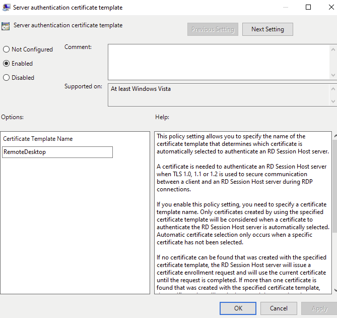 Also there is a specific GPO that we can deploy that points to our new Remote Desktop template, so each machine knows which Certificate to use.