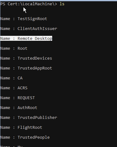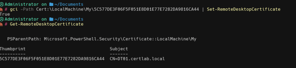 Finally, (and I learned this the hard way) it helps to supply the Remote Desktop Certificate explicitly especially because I had deleted and repopulated the certificate many times during testing. An excellent cmdlet for this is PSCertificationEnrollment which simplifies many the process.