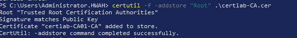 Next, the Root CA certificate from certlab.local must be installed in the Trusted Root Store on the machine in the hwah.us domain.