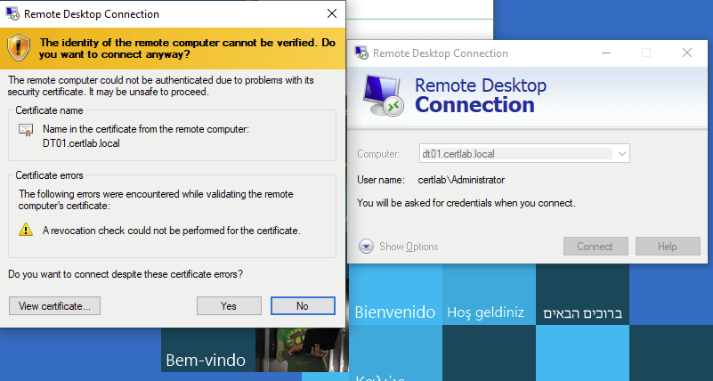 We can now connect to via RDP using the hostname, which removes the mismatched hostname issue. However, I was presented with a new error which indicates that “A revocation check could not be performed for the certificate”
