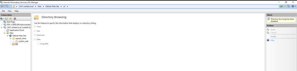 There are a few settings that must be made to allow clients to easily grab the CRL. First the site must by HTTP and allow for directory browsing.