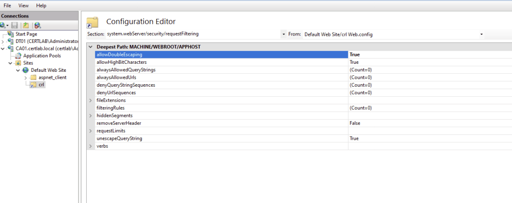 Also, in the virtual directory options select ‘Configuration Editor’ and navigate to system.webServer/security/requestFiltering and select “True” for allowDoubleEscaping. This allows for cross platform compatibility as Windows and Linux handle characters such as \ differently.