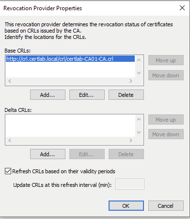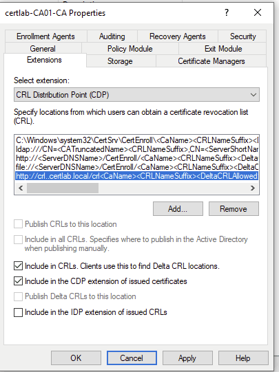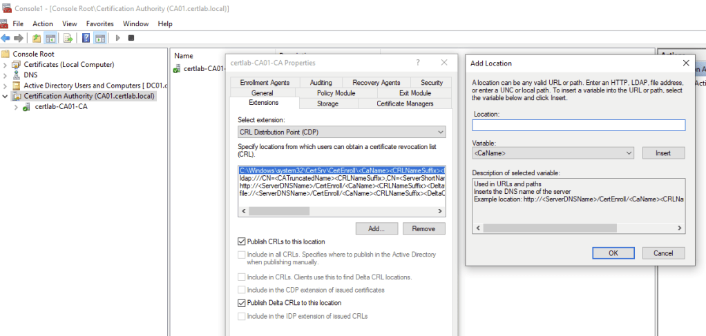 As shown below the location on the the local machine must be set to publish CRLS, and the “Add Location” wizard allows us to set a predictable file format with placeholders for hostname, CRL filenames and the “Delta” file which is a smaller file with the most recent changes.