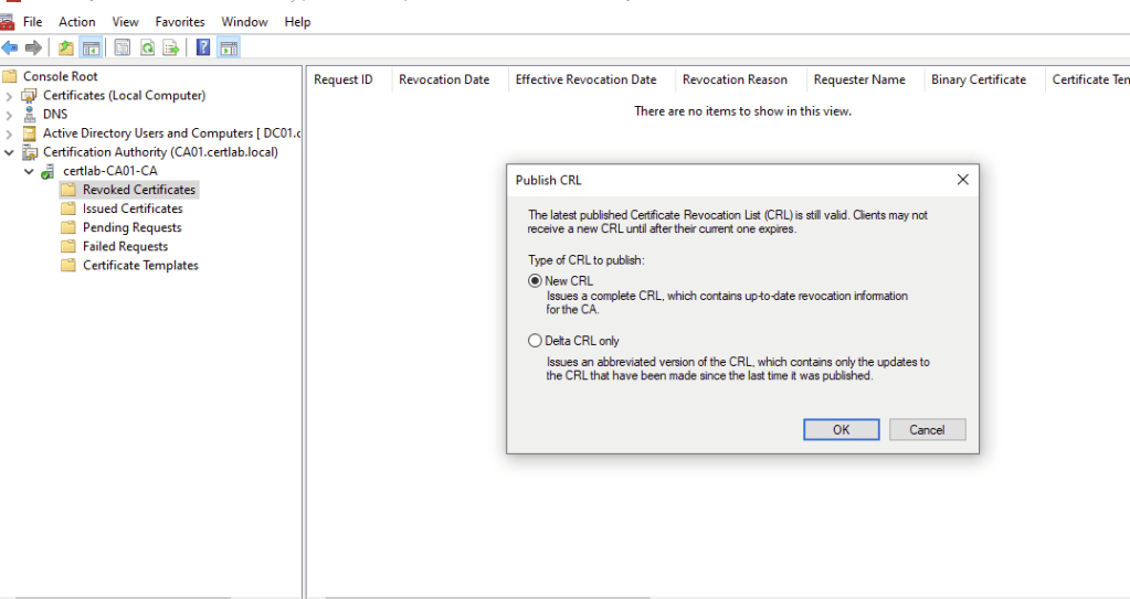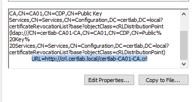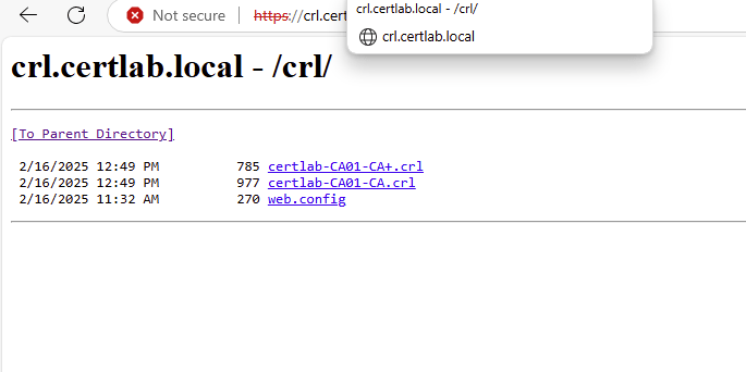 In ADCS the default method is CRL which is checked using LDAP queries. As we saw in the credentialed enumeration post LDAP queries are typically authenticated and restricted to the local network. Without creating a domain trust in which an authenticated user or service account can make queries cross-domain (which would also require opening more ports on the firewall), a solution is to host the CRL on a website available to both domains.