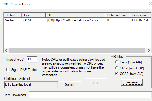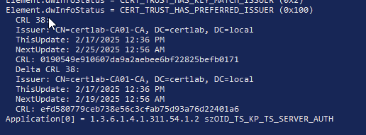 A certificate can be checked with each of its URI’s returning output. After I got my URIs in order, this command gave no errors and successfully pulled the CRL and CRL Delta files.