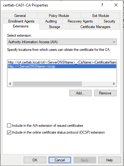 First, our AIA information must be updated to refer to the OCSP endpoint we will set up. As shown below, I used the default template as the hostname for the site is the DNS name of the CA.