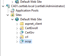 Selecting “include in the online certificate status protocol extension” at the bottom is critical in having this appended the AIA portion of certificates. Similar to the install of CA Web Enrollment, this service automatically creates a Virtual Directory in IIS with the requisite permissions.