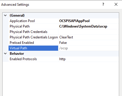 The physical path must me manually set as well, as shown below this is found at C:\Windows\SystemData\ocsp on the CA by default. This directory already has the proper ACL for the application pool account to access.