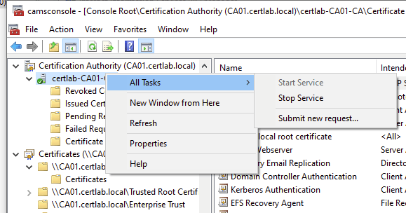 I didn’t publish this certificate in active directory because it will only be used on one machine. Therefore enrolling the CA01 machine in the certificate requires the creation of a Certificate Signing Request (CSR) using the CA01 machine’s private key, uploading the req file (which includes CA01’s public key), downloading the resultant signed certificate and uploading to the LocalMachine Store.