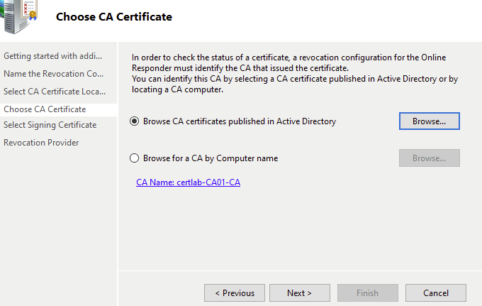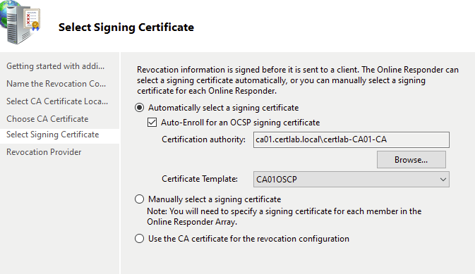 To setup the OCSP I used the “Revocation Configuration” wizard in the Online Responder snap in. Here I selected the CA01-certlab-CA Root CA certificate to instruct the responder to monitor the certlab.local domain.