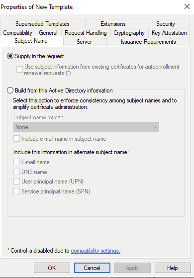 Another way this can happen is with regards to the “Subject Alternative Name” (SAN). As we saw when configuring the certificates for IIS SSL we set the SAN to reflect the DNS name of the web server, which was also the hostname to access the page. What if we wanted to create a general use certificate, not bound to a specific class of AD objects like DNS name or Service Principal Name? Also when creating a template its very easy to leave some of these templates to the default “Supply in the request”, meaning that requests can be made with the abilitiy for the requestor to supply the SAN manually.