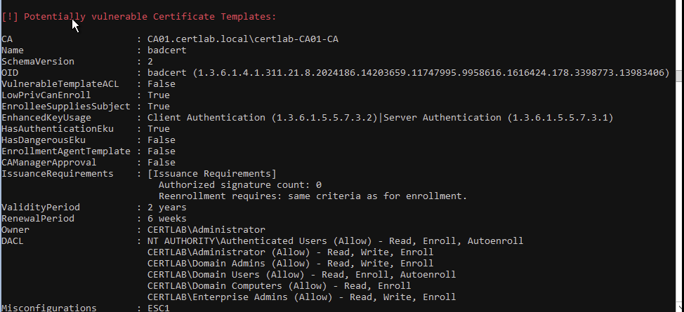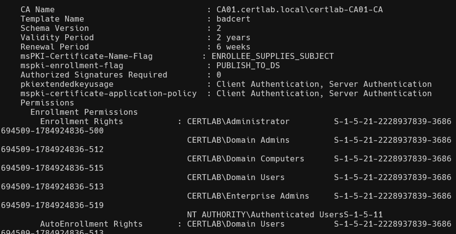 In the preceeding example all I did was take the default Web Server template, add “Client Authentication”, and set for Domain Users to “read”,”enroll”, and “autoenroll”. This brings us to the first of the ESC vulnerable templates, which must conform with the following criteria: