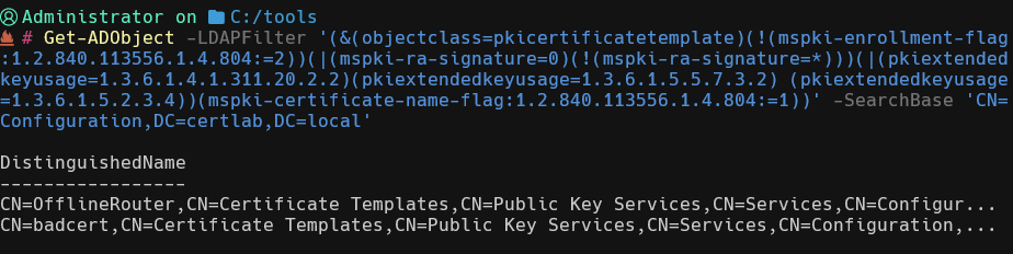 Get-ADObject -LDAPFilter '(&(objectclass=pkicertificatetemplate)(!(mspki-enrollment-flag:1.2.840.113556.1.4.804:=2))(|(mspki-ra-signature=0)(!(mspki-ra-signature=*)))(|(pkiextendedkeyusage=1.3.6.1.4.1.311.20.2.2)(pkiextendedkeyusage=1.3.6.1.5.5.7.3.2) (pkiextendedkeyusage=1.3.6.1.5.2.3.4))(mspki-certificate-name-flag:1.2.840.113556.1.4.804:=1))' -SearchBase 'CN=Configuration,DC=certlab,DC=local'