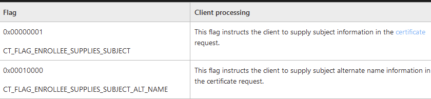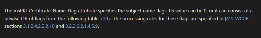 Most Interesting attribute is the CT_FLAG_ENROLLEE_SUPPLIES_SUBJECT value of 1 set in the msPKI-Certificate-Name-Flag. Note: the ‘1.2.840.113556.1.4.804’ is the ‘LDAP_MATCHING_RULE_BIT_OR‘ modifier which according to the MS-CRTD documentation: