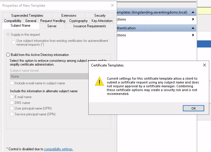 When creating a template that is vulnerable to ESC1 in windows, I received a warning
