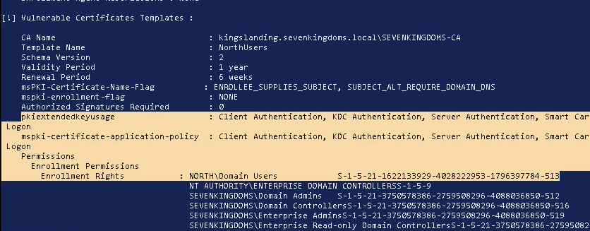 So nice of them! Here i was setting the SAN to be configured by the user and set enrollment rights for users in the north.sevenkingdoms.local domain, with no sign off required (which is default). This template was based on the “Kerberos Authentication” template. Running the windows executable version of Certify reveals the vulnerable template (note: the Windows version does not reveal the ESC number for the vulnerability like the Linux version does).