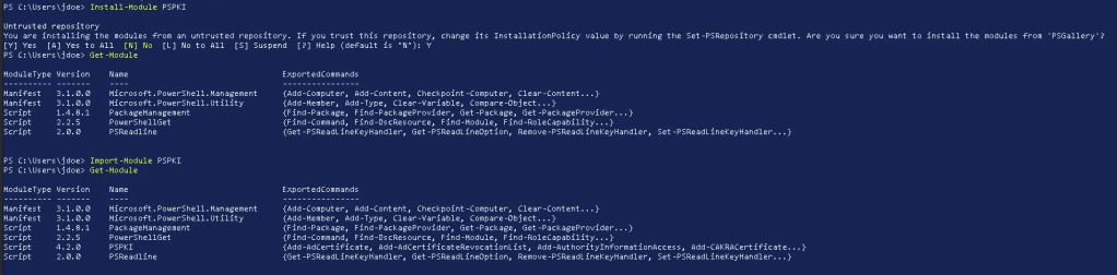 PSPKI is a modules that simplifies many of the certificate functions that certutil handles by allowing a more familar object oriented Powershell workflow. Our low privilege user, jdoe, is able to download and import the PSPKI module available from the PowershellGallery.