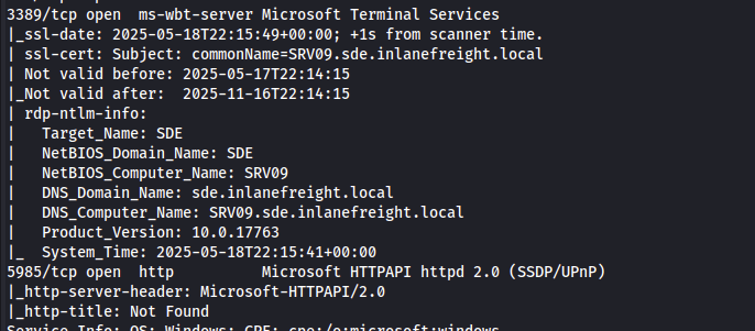 In the introduction, we are told that one of the domains may be inlanefreight.local. Running a quick nmap scan on the host we are given access to will help get the initial domain name with which we can log in with.